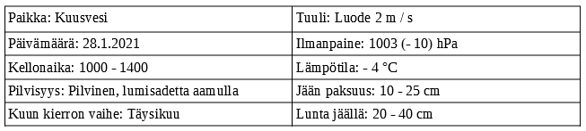 Olosuhde oli ennen kaikkea raskas: Lunta pahimmillaan 40 cm. Alla kovempi lumikerros, joka kuitenkin petti askel askeleelta. Vielä ennen varsinaista 10 – 25 cm jääkerrosta etenemistä hidasti 5 – 10 cm kerros vettä. Lisäfiilistä antoi lumisade ja vain tuulen sekä rajun pakkasen puute pilasi kunnon rajun kelin. Ilmanpaine oli matala sekä nouseva kuunkierron osuessa tasan täydenkuun vuorokauteen.