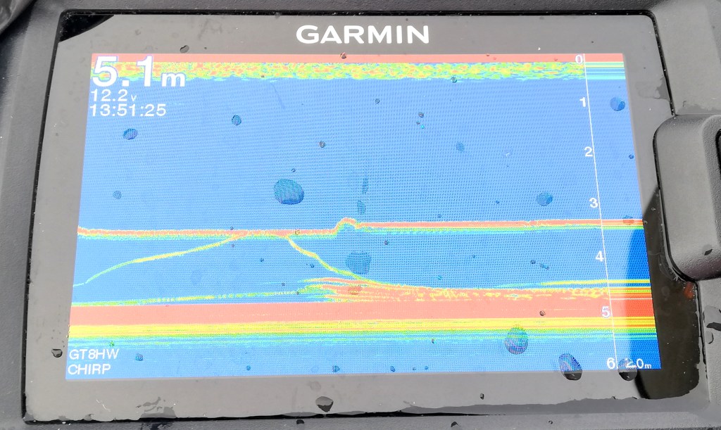 Kartta ei tuolla pidä ihan paikkaansa eikä tilannetta helpottanut se, että myös GPS käyttäytyi epätarkasti. Osuin aluksi haluttua syvempään 12 – 14 m veteen, joten aloitin siitä. Tein muutamia reikiä, mutta ainoa havainto oli pienen pieni pikkukalaparvi välivedessä.