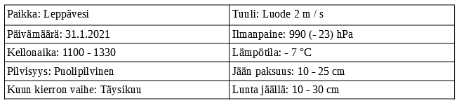 Sää oli silmämääräisesti perus puolipilvinen talvisää, mutta ilmanpaine oli reilusti matala jo kolmatta päivää. Pakkasta oli seitsemän astetta kevyen luodetuulen vahvistamana. Jään päällinen oli raskaskulkuinen, kun vettä oli 15 cm paksuhkolla lumikerroksella kuorrutettuna. Jäätäkään ei liikaa ollut, sillä mihinpä se tuon lumikerroksen alta vahvistuisi. Päin vastoin, pehmenemisen enteitä oli jo aistittavissa.