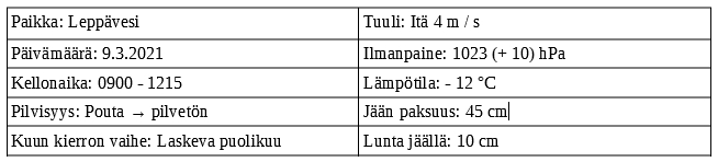 Keli oli rapsakka. Kylmä itätuuli puhalteli aamun pilviharson pois ja aurinko pääsi jo vähän lämmittämään. Ilmanpaine oli pari päivää noussut eikä loppua näkynyt, nyt oltiin 1023 hPa:n lukemissa. Jäätä, todella huonolaatuista, oli keksimäärin 45 cm ja lunta kymmenisen senttiä. Kuun kierto oli laskevan puolikuun vaiheessa.