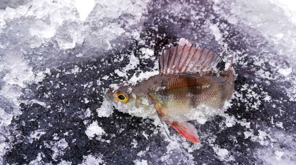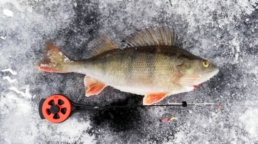 Vaihdoin morriin. Filmikärki nousi hieman, aivan höyhenen kevyesti ja ajattelin, että pientä ahventako siellä vain pääosin kävikin närppimässä jigejä. No, ei todellakaan ollut, vaan vähintään samaa täydellistä filekalakokoa oli tämäkin ahven, jostain syystä vain tärpit olivat olemattoman kevyitä. Morriin ne kuitenkin sai jäämään paremmin kiinni ja hetken päästä jäällä olikin jo viitisentoista toinen toistaan komeampia ahvenia.