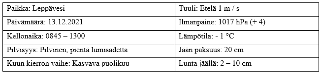 Kelissä ei valtavia muutoksia ollut tapahtunut: Lauhaa ja harmaata joulukuista säätä, ainoa poikkeus viimevuosien normaaliin oli kantava ja paksu teräsjää. Ilmanpaine oli jo pitkään ollut täysin vakio eikä suuria muutoksia tullut vieläkään, joskin aivan pientä laskua tapahtui aamusta alkaen. Tuuli oli kevyt hönkäys etelästä ja kuun kierto yhä kasvavan puolikuun vaiheessa. Jäätä 20 cm, lunta vaihtelevasti 2 – 10 cm.