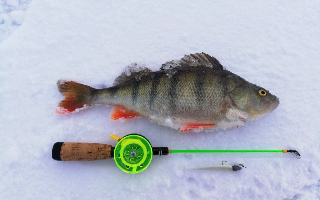 Loppuun alkoi satelemaan lunta ja puoliepätoivoisesti virittelin vielä lumisadespeciaalia, valkoista sairaa, siiman päähän. Tuloksellisesti, sillä tyhjälle luotaimen ruudulle syöksyttiin vauhdilla! Nyt ei arkailtu, vaan 8 cm jigi imaistiin kerralla kunnon tärpillä ja jäälle nousi 605 g ahven! Yksi suurimmista pilkkiahvenistani koskaan. Kaverit, joita sillä luotaimessa näkyi olevan, eivät kuitenkaan koskaan palanneet alle.