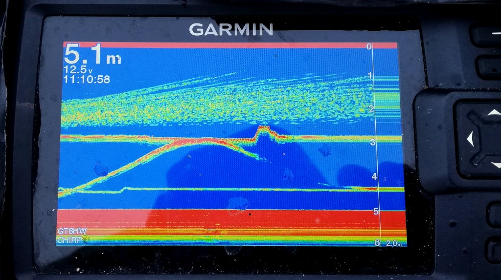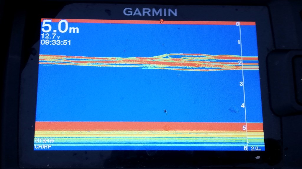 Sen kummempaa aamusyöntiä ei sitten tullutkaan. Kokeilin kaikkea mahdollista, kairailin aluetta ympäri ja palasin välillä aloitusreiälle, mutta laihoin tuloksin. Siellä täällä näkyi välillä kaikuja isoista ahvenista, vaan ottamaan niitä ei saanut: Iso jigi oli välttämätön houkutin ja morri ottipeli, mutta vaihto houkutuksen jälkeen morriin kesti nopeimmillaankin liian kauan ja yksittäiset ahvenet lipuivat pois.