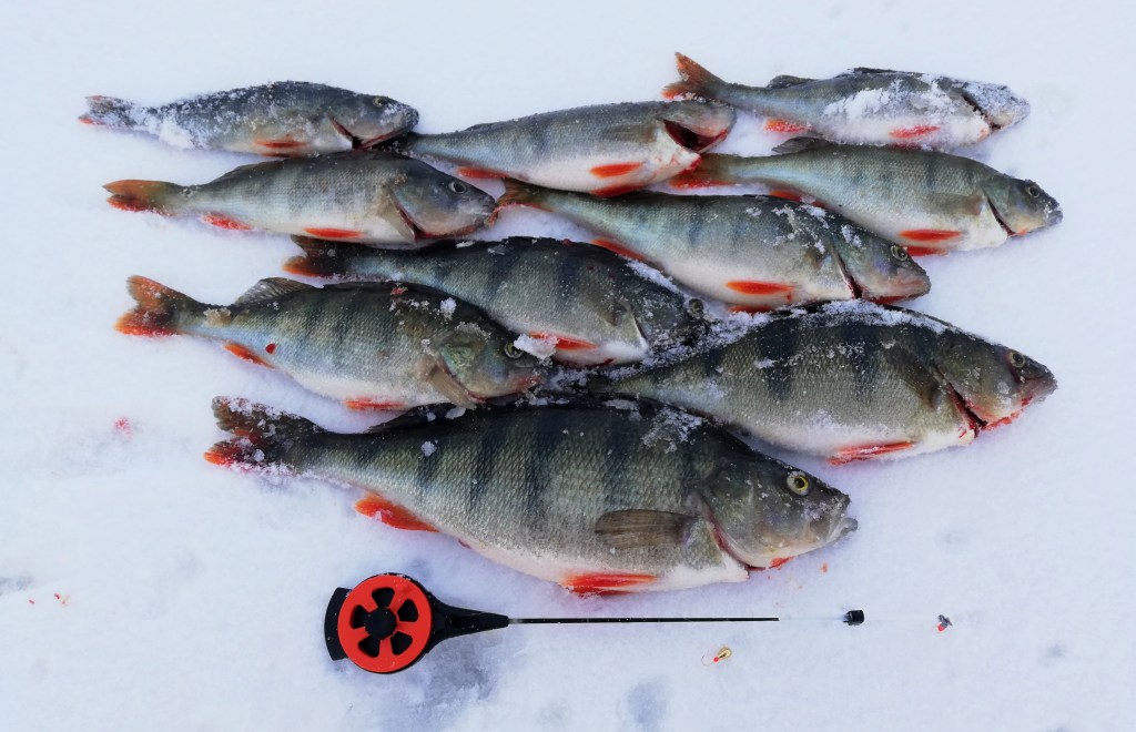 Klo 09:11 alle löysi ensimmäinen ahven. Jos mahdollista, se oli vielä varovaisempi kuin toissa päivänä nousseet lajitoverinsa, mutta kelpuutti lopulta kultamorrin. Samaan putkeen alkoi tulla välittömästi lisää ja 10 minuutissa jäällä oli jo neljä kunnon kokoista ahventa sekä yksi pienempi.