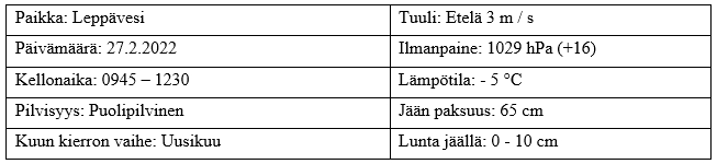 Keli oli keväisen valoisa ja aurinko ohuen pilviharson takaa jo lämmitti. Lämpötila nousi aamun kymmenestä pakkasasteesta iltapäivän pikkuplussaan. Ilmanpaine oli noussut ja vakiintunut edellisenä iltana korkeisiin 1030 hPa:n lukemiin ja kuun kierto oli uudenkuun vaiheessa. Jäätä oli sen verran, että melkein joutui hankkimaan pidemmän kairan.