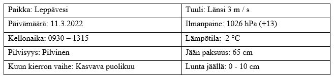 Kevät-talvi, keskipäivä ja 2.5 kk hiljaisena ollut paikka. Ei kummoiset toiveet ollut. Toisaalta keli oli pilvinen ja kuun kierron vaihe viime talvien perusteella paras mahdollinen, joten kenties ahkera etsiminen vielä palkittaisiin. Paikka oli suuremman lahden kapeampi edusta, jossa syvyys nousee 4 – 6 metriin ympäröivistä syvänteistä ja tuo 4 – 6 m vedenalainen salmi on ollut se paras ja ainoa kalaa tuolla antanut paikka. Tällä kertaa, yllättäen, täysin kuollutta. Ei kalan kalaa, ei merkkiä edes pienestä kalasta. Muutama reikä sinne tänne ilman muutosta, jonka jälkeen oli jälleen lähdettävä tyhjin käsin kotiin.