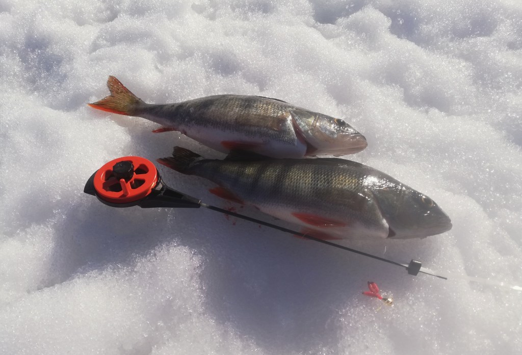 Varovaisella ahvenella oli myös seuraa, joista toisen sain noin 5 min houkuttelun jälkeen ylös. Tämän jälkeen pieni siimahärdelli ja kaksi muuta luotaimella näkynyttä ahventa olivat poissa. No, jotain havaintoja sentään ja motivaatio vielä viimeiseen rei’itykseen löytyi. Tein parit reiät joka suuntaan edellisestä, sillä mistäpä sitä muuten tietäisi minne luotamella näkynyt parven tynkä liikkui. Tai no, eipä sitä tiennyt tuollakaan tapaa, sillä ainuttakaan kalahavaintoa ei sen koommin tullut.