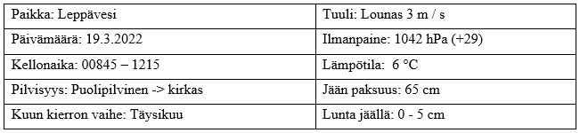 Jälleen siis surkea reissu saaliin puolesta. Tuokin alue saa nyt jäädä lepäämään, ainakin aloituspaikka. Lopetuspaikan lahti ja sen edusta nyt voisi periaatteessa tulla vielä kyseeseen, mutta sitä ennen haluan muualle: Salmeen. Maaliskuun loppua se aikanaan oli, kun siellä vietettiin kevätjuhlia, joten sama kai se on käydä jo seuraavaksi katsomassa, mikä siellä olisi meno. Myös Kuusveden kevätjäät pitää ottaa harkinnan alle, kun ei Leppävedellä nyt onnistu.