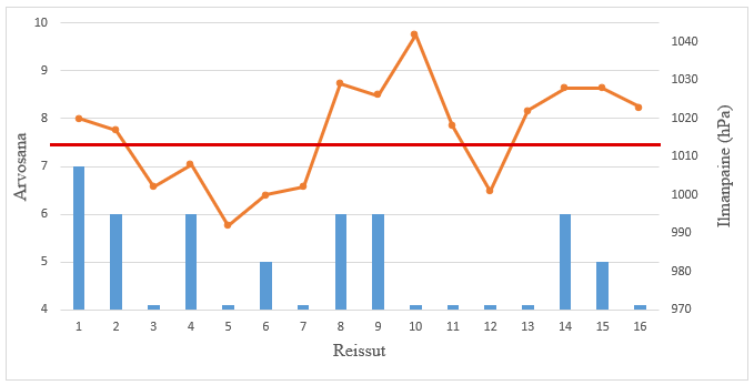 KUVA 1: x-akseli: reissut, vasen y-akseli: reissujen arvosanat, oikea y-akseli: ilmanpaine. Oranssi kuvaaja: ilmanpaine, siniset palkit: reissujen arvosanat. Punainen viiva: normaalipaineen raja.