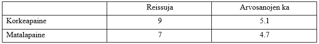 Ei luoteta vain silmämääräiseen arvioon, vaan lasketaan vielä kummankin ilmanpaineen reissujen arvosanojen keskiarvot, jotka ovat esitetty alla olevassa taulukossa: