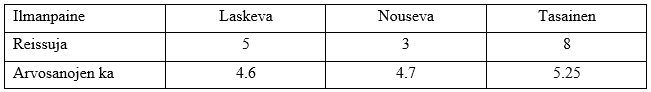 Silmämääräisesti näkyy jo selvästi, että tällä kertaa tasaiselle ilmanpaineen muutossuunnalle osui parempia reissuja, mitä muuttuvalle ilmanpaineelle, jolle osui vain kolme yli nelosen arvosanan reissua. Muuttuvan ilmanpaineen yli nelosen arvosanan reissuista kaksi tuli laskevalla ja yksi nousevalla ilmanpaineella. Todetaan asia vielä keskiarvojen kautta alla olevasta taulukosta: