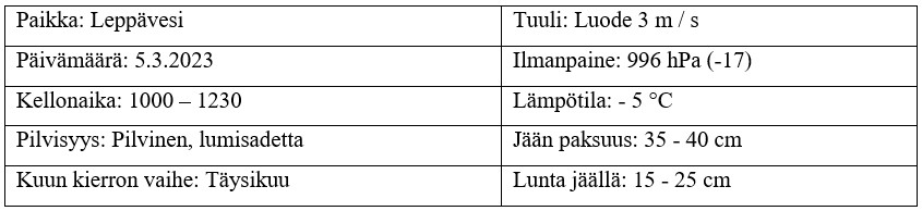 Keli oli kovinkin talvinen. Lunta oli ja sitä tuli, jopa vettä oli kertynyt lumen ja jään väliin. Kylmäkin tuntui luoteistuulen ansioista, joten tietämättään olisi kuvitellut olevansa tammikuun pilkkireissuilla. Ilmanpaine oli ollut viime päivät matalana ja sellaisena myös pysyi. Jäätä oli hieman vaihtelevasti 35 – 40 cm riippuen siitä, kuinka pintamössö oli jäätynyt ja lunta jäällä 15 – 25 cm. Kuun kierto oli täyden kuun vaiheessa.