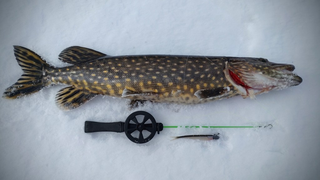 Alla oli ns. valmiina, siinä hetkessä pieneltä ihmeeltä tuntunut, neljän ahvenen parvi. Päätin lähestyä niitä morrilla ja yhden sainkin. Koko ei valitettavasti päätä huimannut. Enkä varsinaisesti onnesta pyörtynyt huomatessani, että loput säikähtivät ensimmäisen tärppiä ja uivat tiehensä. Rikoin reikärivirutiinin ja kairailin enempi tuon reiän ympärille, mutta vain yhden yksinään uivan ahvenen enää löysin. Kiintiöhaukikin tuli loppuun piristämään muuten hiljaista pilkkireissua.